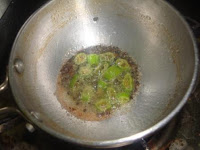 - In the pan pour the gingelly oil and add the mustard seeds. When the mustard seeds begins to sputter add the Green chilli, curry leaves and hing and fry it for 30 seconds.