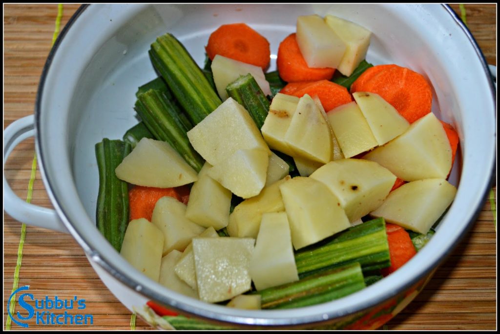 - You can add the vegetables of your choice in the Sambar. The common vegetables are Brinjal, Lady's Finger, Drumstick, Potato, Raw Banana, Carrot, Capscium, etc., You can choose the vegetables that you like and use it.