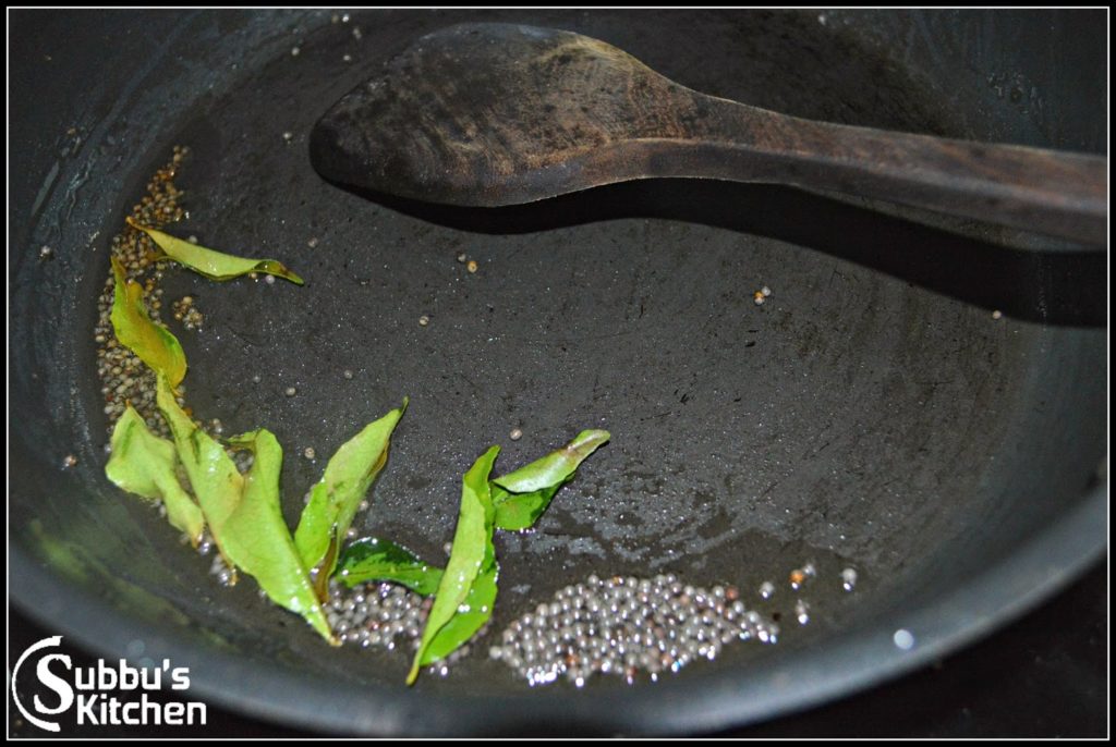 - Heat oil in a pan. Add mustard seeds and allow it to sputter. Add green chili and curry leaves and saute for few seconds. Add shallots and saute in oil till translucent