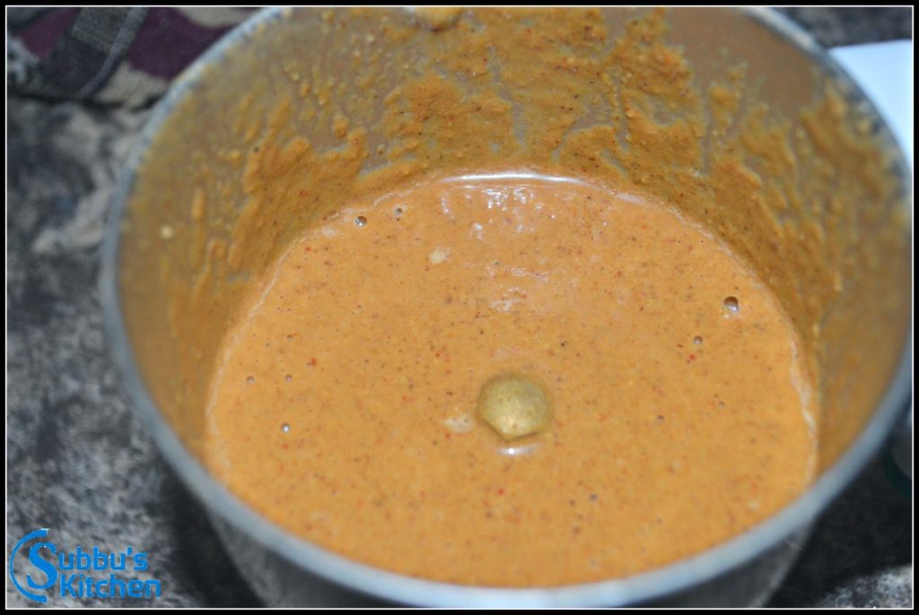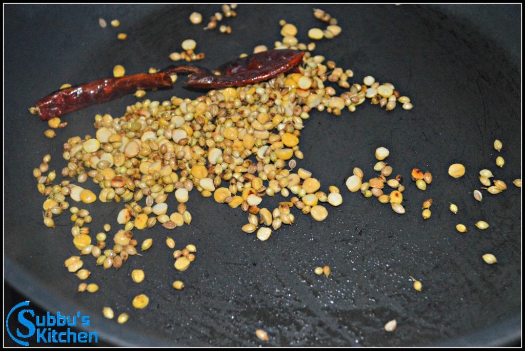 - Heat oil in a pan. Add the grinding ingredients other than coconut and fry them till the dal turns light brown color. Cool the roasted ingredients and take it to mixer jar and add grated coconut. Grind them to a fine paste and set it aside