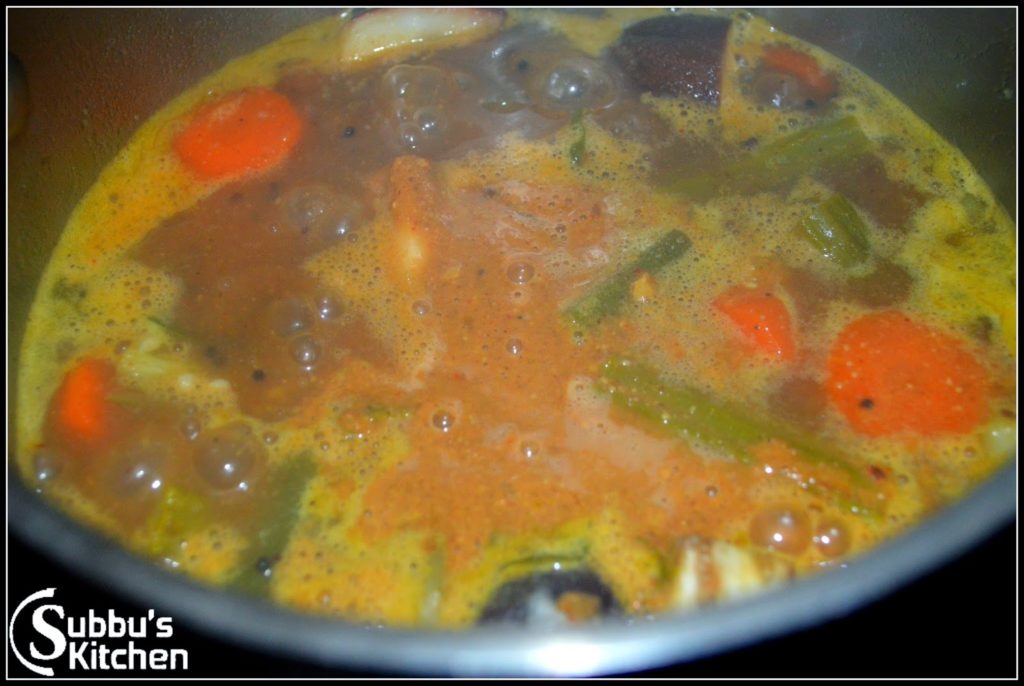 - When the vegitables are cooked add tamarind extract along with salt and asafoetida. Allow the tamarind to boil (for about 5 minutes in medium flame) till its raw smell goes off
