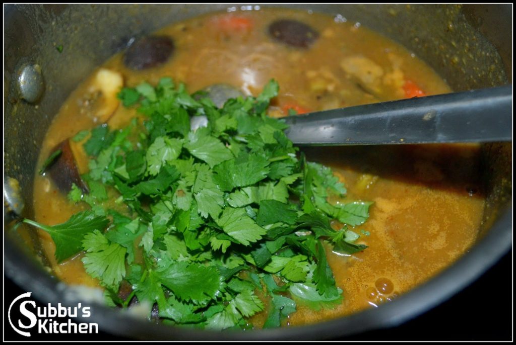 - Boil the sambar in medium flame for about 2 mins. Switch off the flame and garnish with coriander leaves.