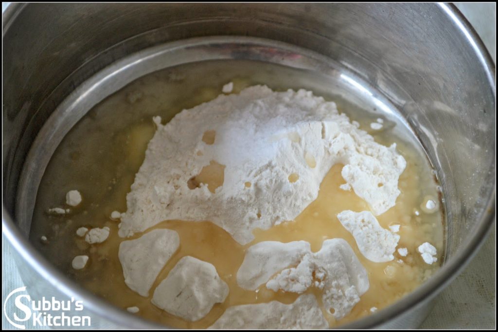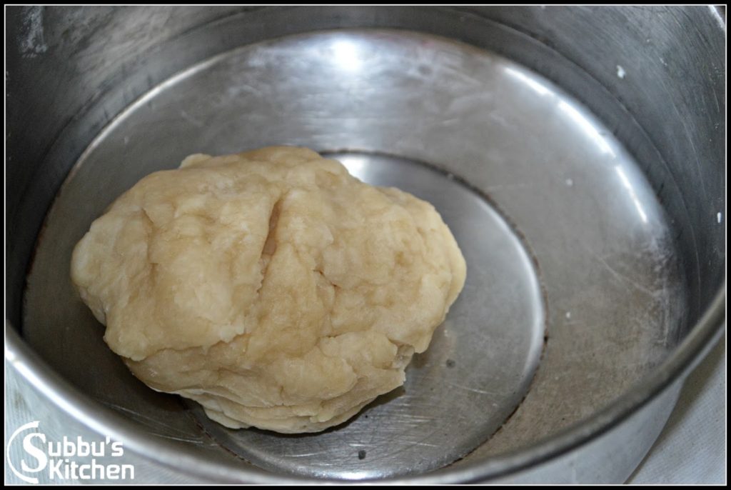 - Take a bowl and add maida, salt. Add about 60ml or ¼ cup of oil and mix well. Add water little by little and knead the maida to a soft dough. Cover the dough and let it sit for 15-20 minutes
