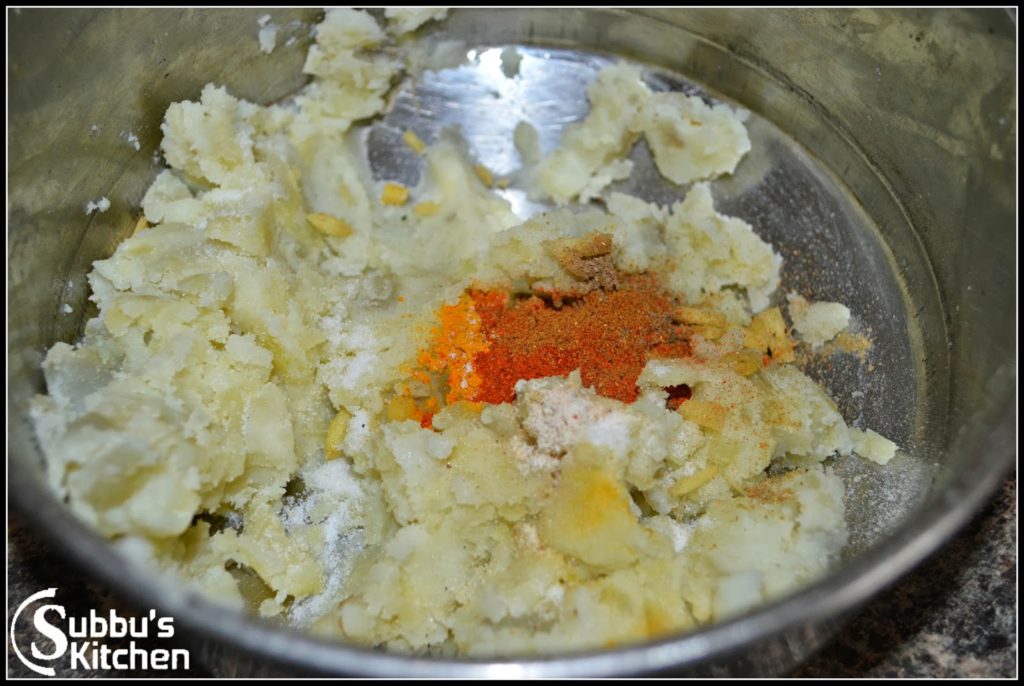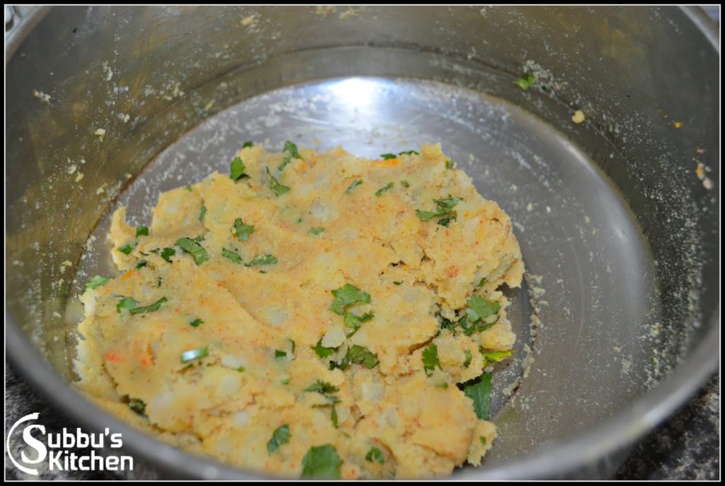 - Boil the potatoes and remove the skin and mash it well. Add salt, hing and other spice powders along with turmeric and mix well. Add chopped coriander leaves and mix well. Now our filling is ready. Lets make our kachori now