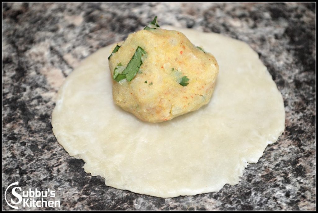- Make small and equal balls out of the maida dough. Using a rolling pin, roll each ball to a small circle and take a spoon full of aloo filling and keep it in the center and cover the filling and gently press it so that that the filling is evenly spread within the kachori. Repeat this step for rest of the dough and filling