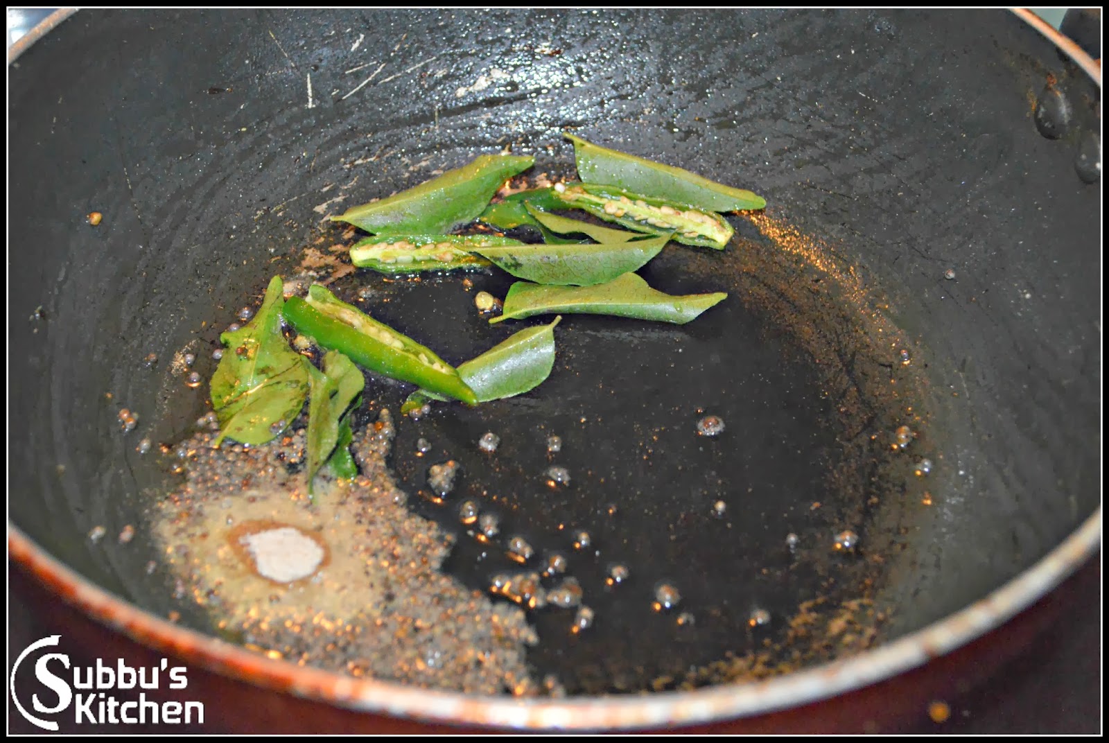 - In the pan, pour some oil and fry the ladys finger( we can also use brinjal or drumstick). Once it is cooked, take it in a plate and keep it aside. In the same pan, now add oil and when the oil is hot, add mustard seeds. When the mustard seeds starts to sputter, add curry leaves, hing and vertically split green chilli and fry for a minute