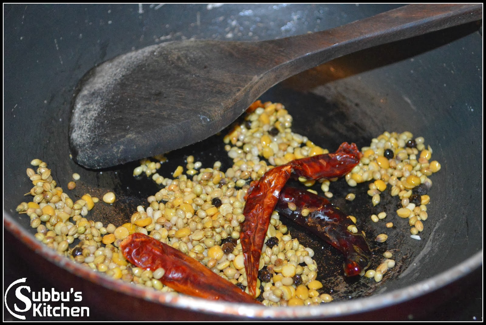 - Dry fry raw rice and fenugeek seeds in a pan and take it in a mixer. Pour some oil and add the rest of the grinding ingredients and fry till the dals turn golden brown color.
