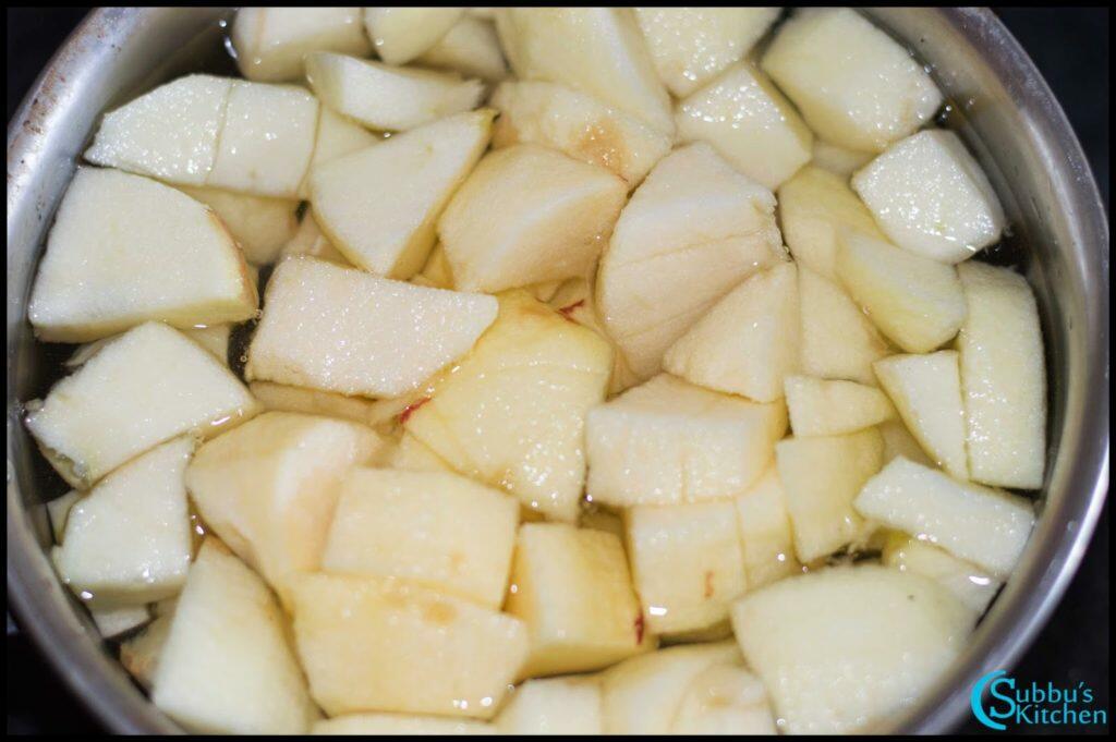 - Wash and peel the apples and chop it into small cubes. Soak it in water to avoid decolouring.