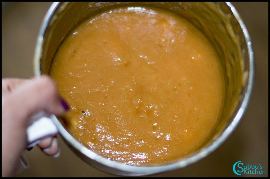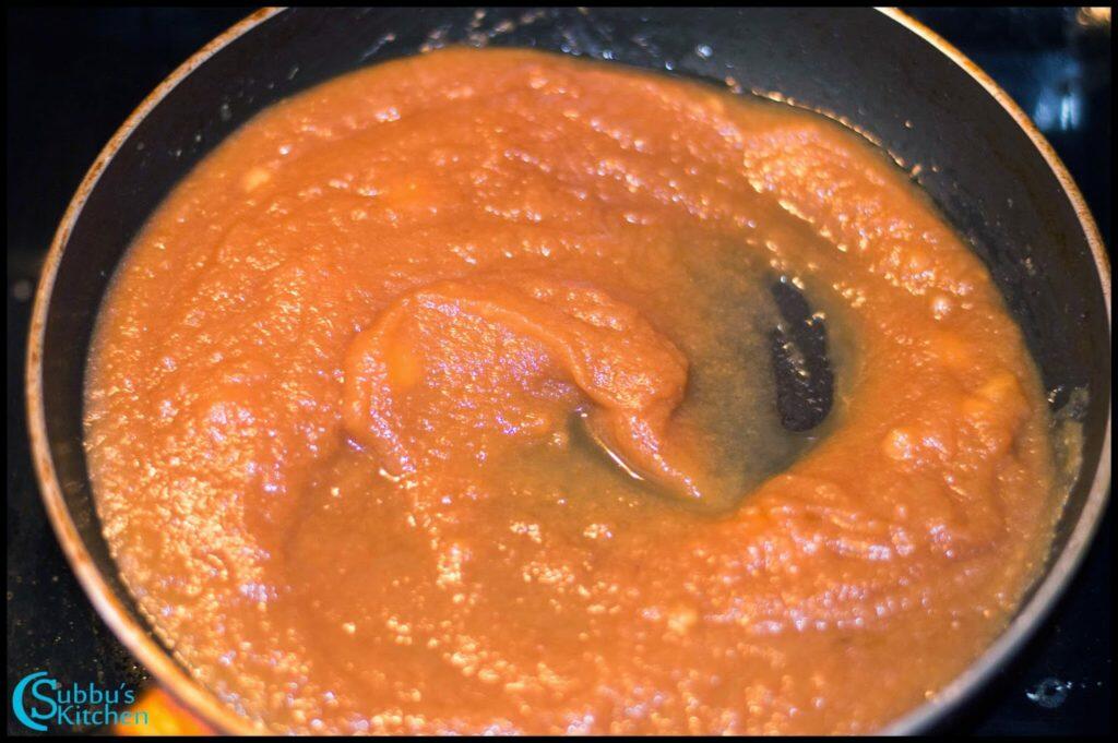 - To the pan, now add the ground apple pulp and saute it in ghee.
