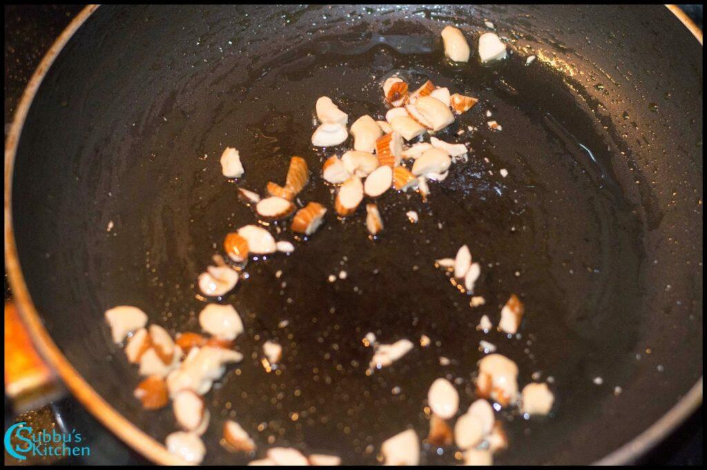- Heat a teaspoon of ghee in a pan and add broken cashews and almonds and fry till they are slightly golden brown color. Take these out and set it aside.