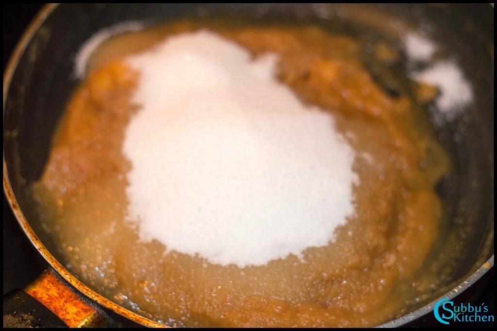 - Then add sugar to the pan. Adding sugar again dilutes the apple halwa. Keep stirring to avoid halwa getting burnt.