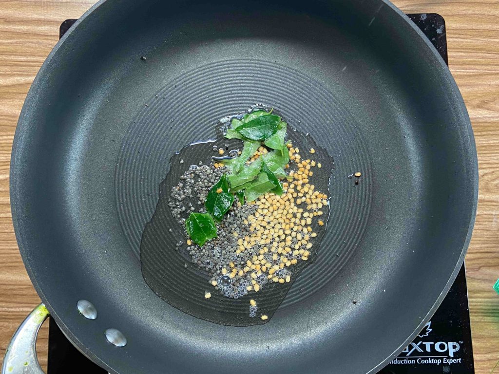 - Heat oil in a pan. Once the oil is heat add mustard seeds and allow it to sputter. Add split urad dal and fry till the dal turns golden brown. Finally add the curry leaves and fry it for few seconds in the oil