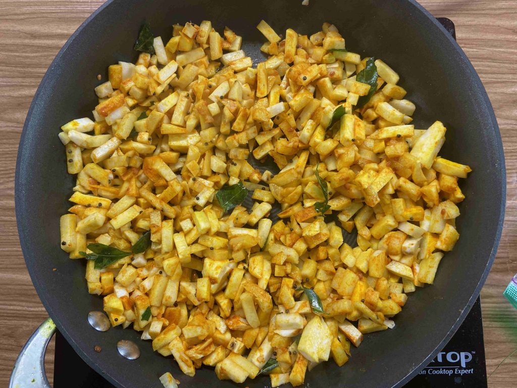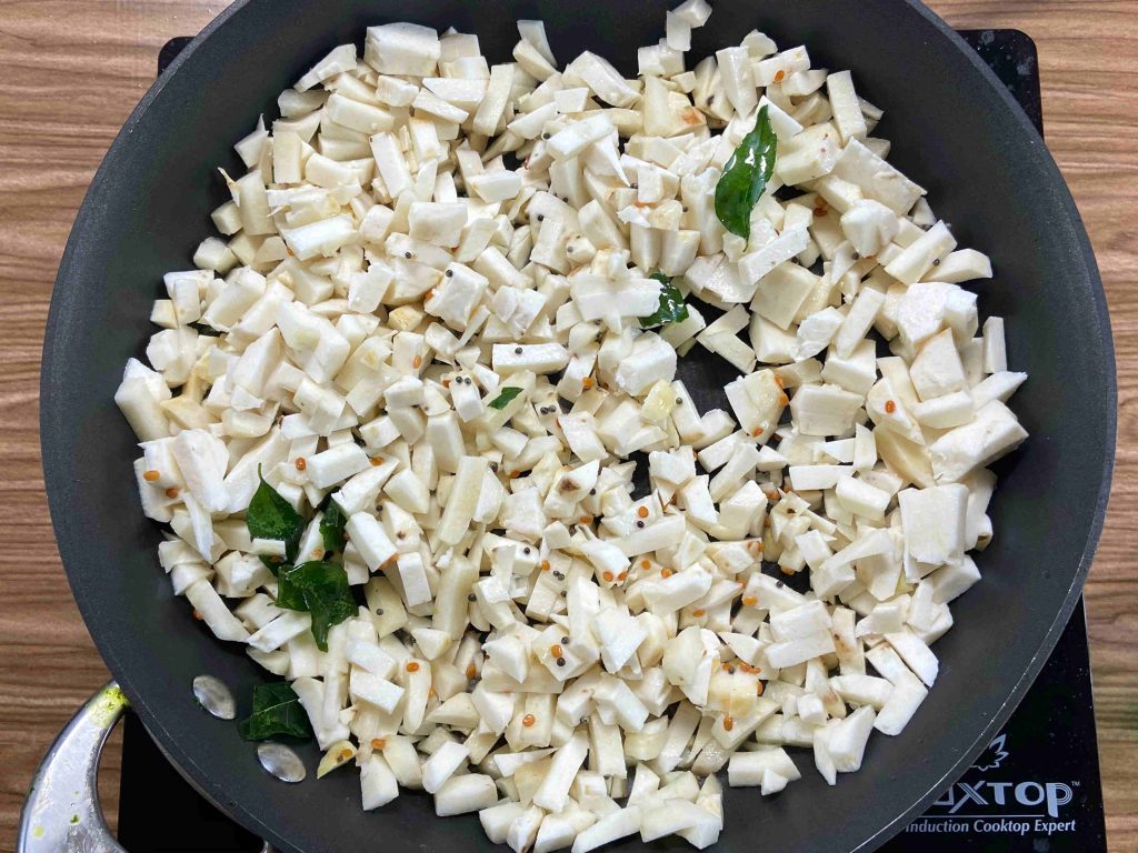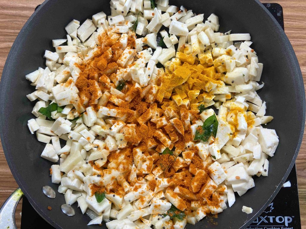 - Add the chopped tara root. Add one tablespoon of oil and mix well. Add turmeric powder, sambar powder and give a good stir