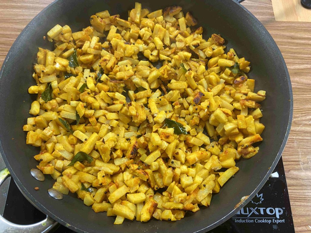 - Once it's cooked, add another table spoon of oil and mix well. Simmer the stove and allow it to cook for another 5 more minutes without covering the pan. This will help to get the tara root more crispier.