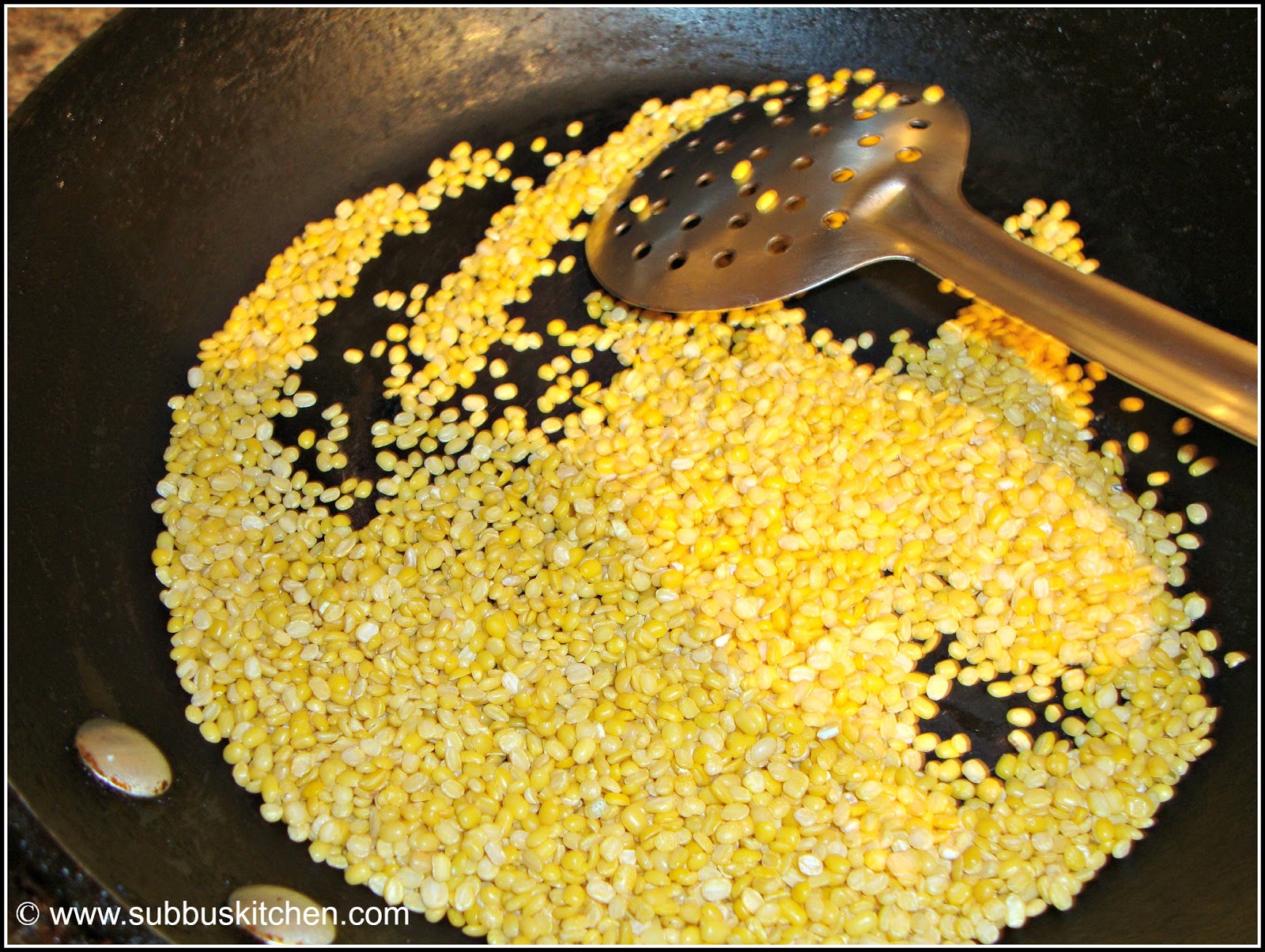 - Dry fry the moong dal till it turns light red in color. The reason we fry the moong dal is that, the dal will cook easiliy and quickly with little water. Also the aroma will be very good.
