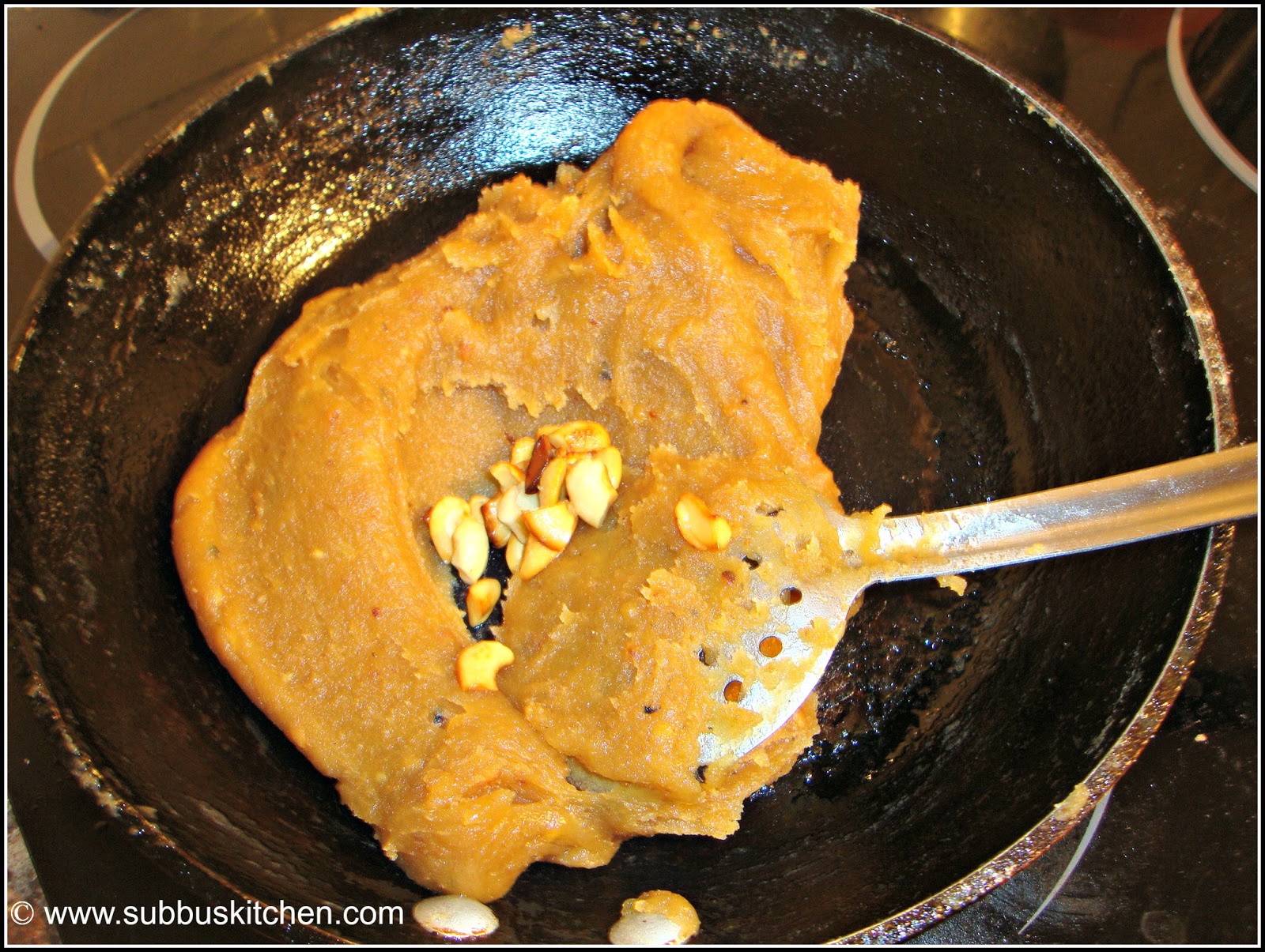- Meanwhile, heat the kadai and add 1 tablespoon of ghee and fry the cashews till they turn golden brown color. Take the fried cashews in a plate and keep it aside
