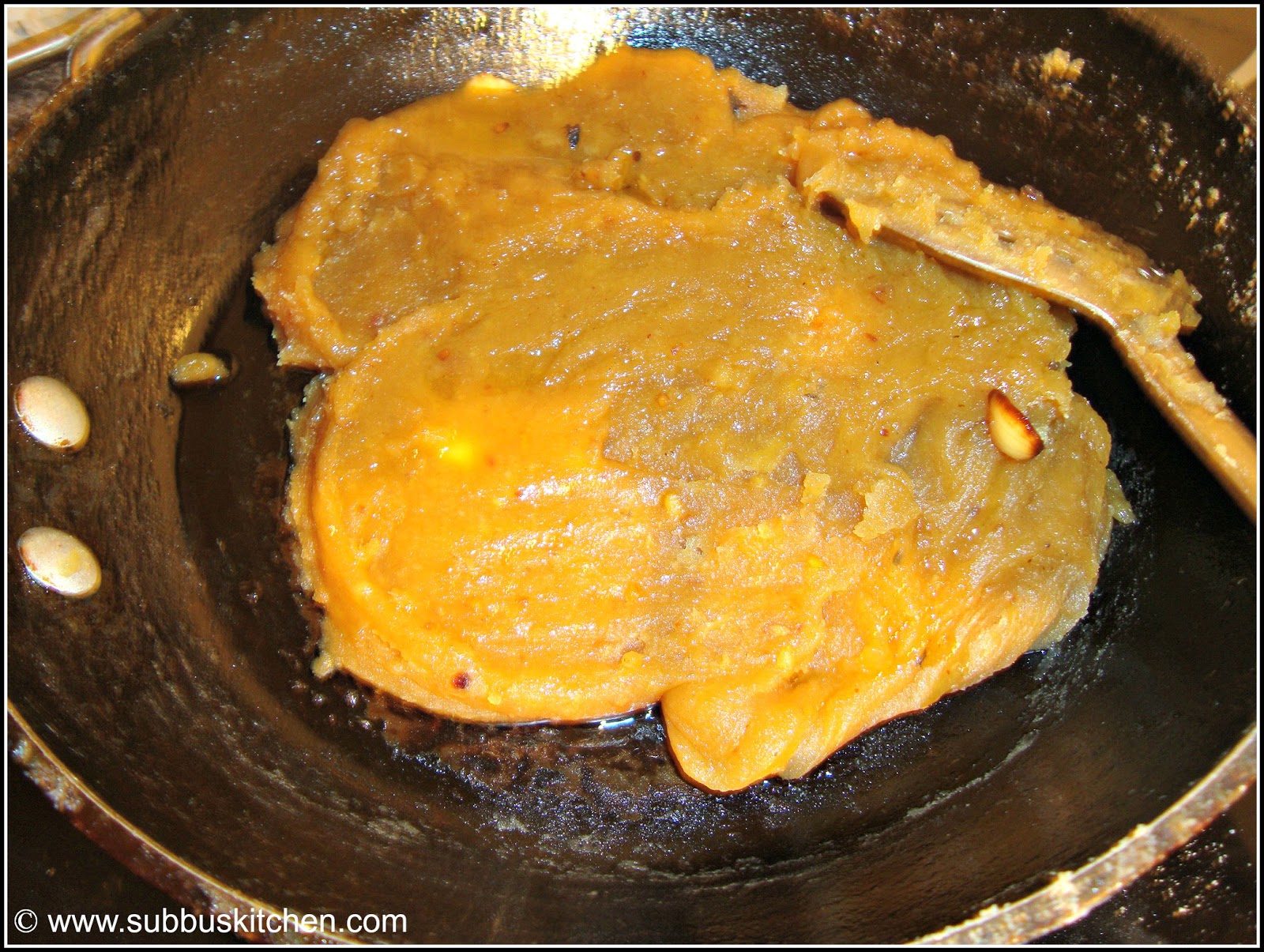 - Keep stirring the halwa. Whenever the mixture stick more on the pan, add ghee and start stirring again. We need to keep on stirring continuously in a medium flame though we feel pain in our hands :(. Atleast we need to stir for 30 minutes to make the halwa cook completely and becomes thicker