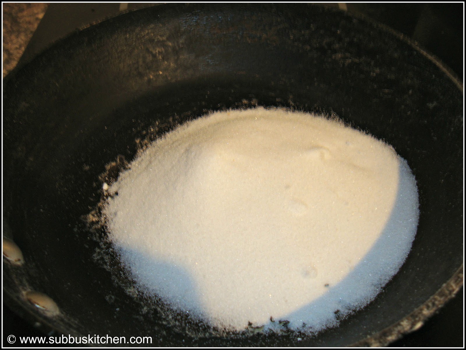 - Into the same pan, add sugar and pour in ½ cup of water.