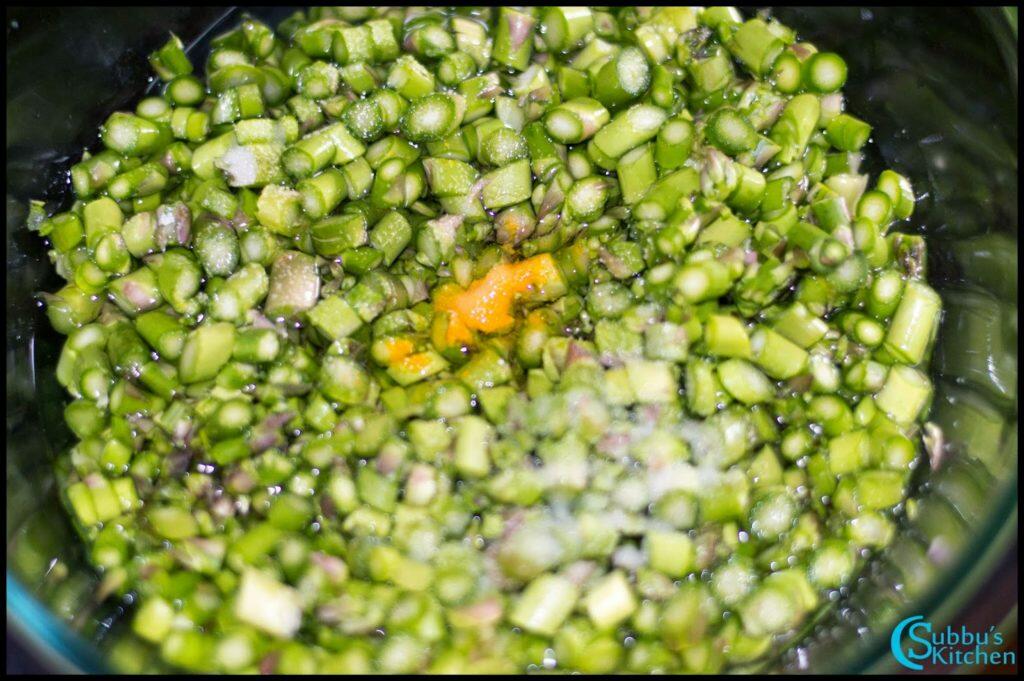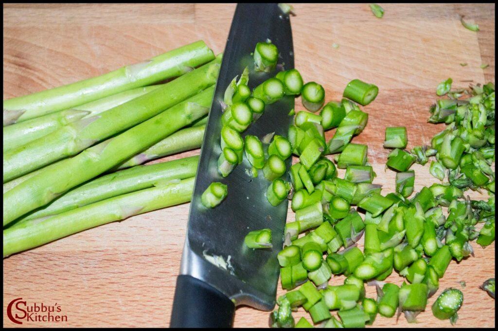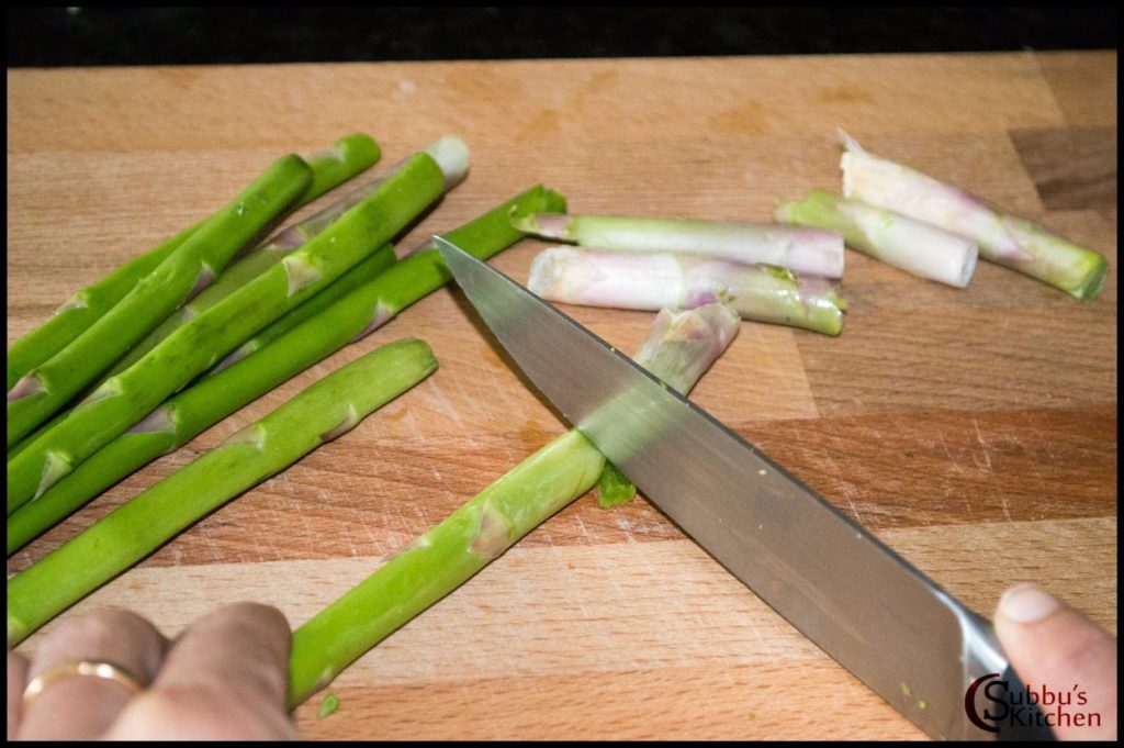 - Its better to use tender Asparagus. Tender Asparagus cooks faster and tastes great. If the asparagus is not tender, then peel the skin with a vegetable peeler. Tender ones doesn’t need peeling. Cut 1 inch piece of the bottom and discard. Chop the rest of the stem into fine pieces.