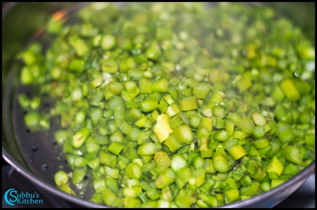 - Take the finely chopped asparagus in a pan and add water to soak them. Also add a pinch of turmeric powder and salt and keep it on flame and allow it to cook till they are tender and soft. Usually cooking asparagus takes only 5-6 minutes.