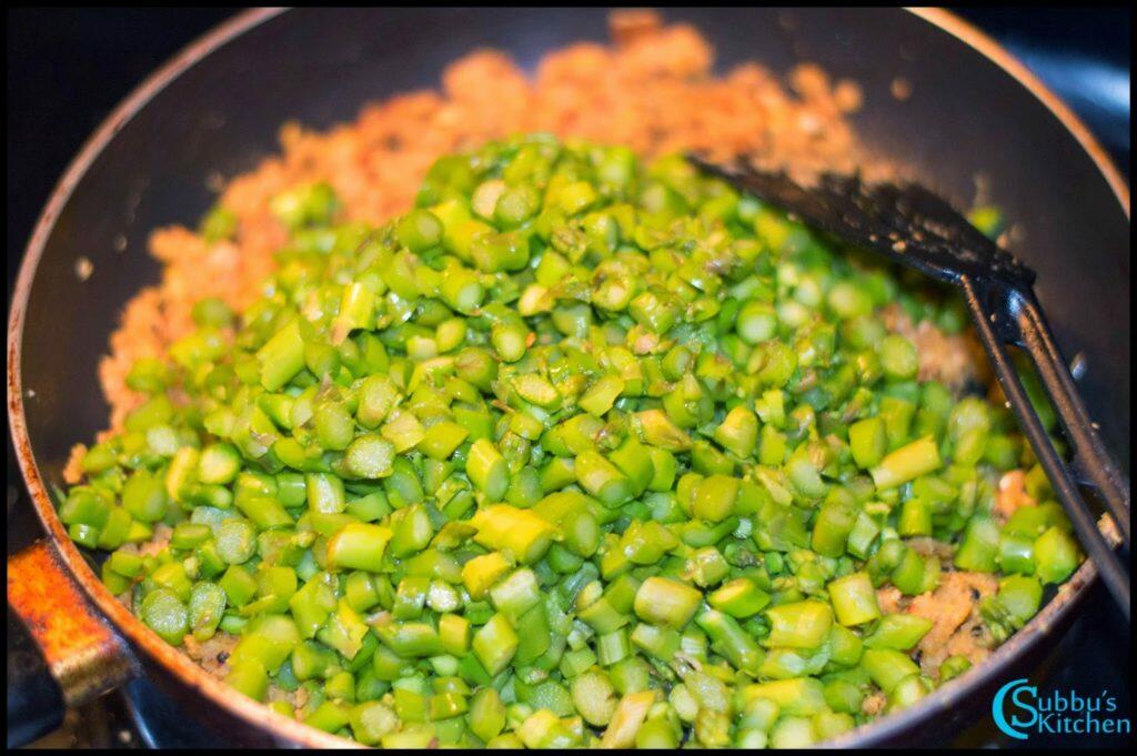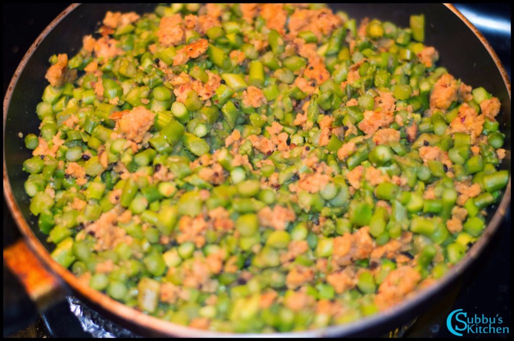 - Allow the ground paste to cook in oil and it will crumble down into smaller pieces. Finally add the cooked Asparagus and mix well with the crumbled dals.