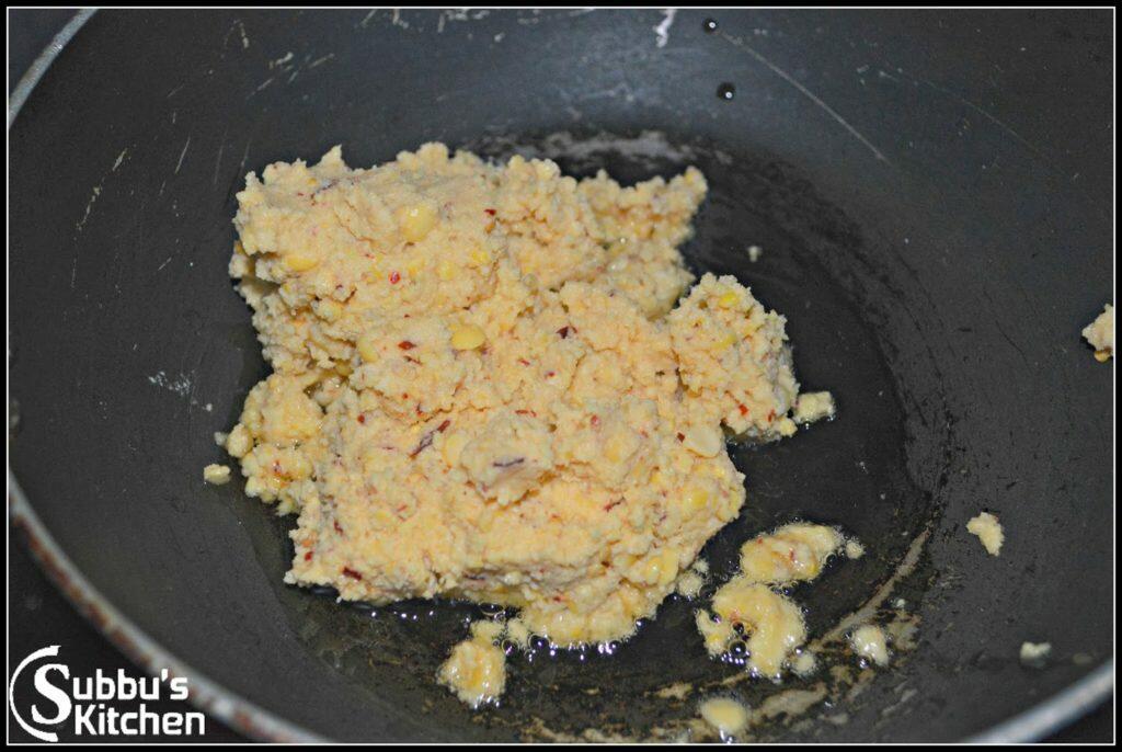 - The ground mixture should be coarse. Heat the oil in the pan, and add the ground paste and keep the flame in low