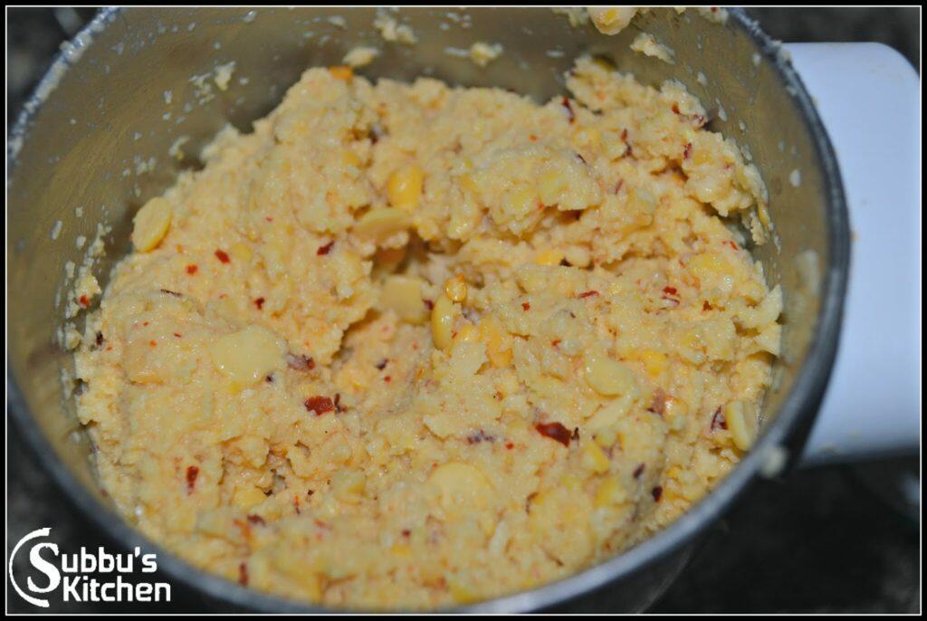 - Rinse the Dal's and strain the water and grind it in mixer once along with red chilli, hing and salt without adding water