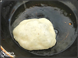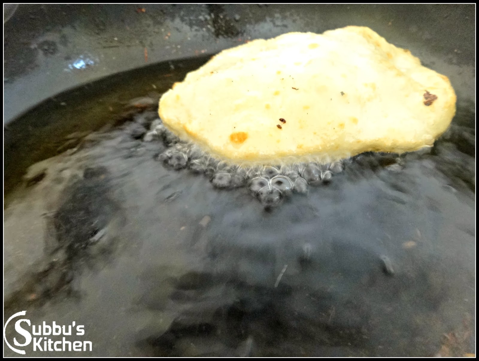 9. Turn the Bhatura to other side and fry it. Remove the puffed Bhatura and place it in a paper towel to drain excess oil