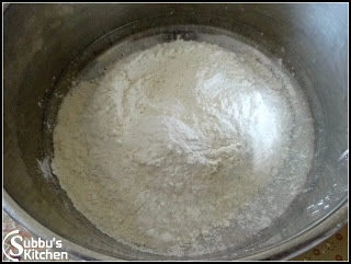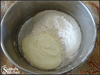 3. Take curd and mix salt and sugar and mix well. Add this curd to the bowl of flours