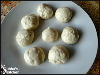 6. After 3 hours, when we open up the wet cloth, we can notice that the dough has nicely fermented and risen up(increased in size). Take 12 equal portions of dough and roll it to ball. Keep it aside for 10 minutes