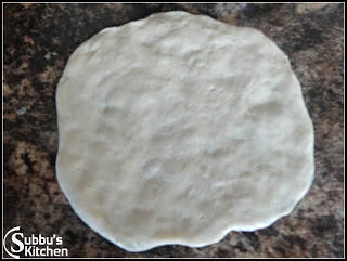 7. Heat oil in a pan. Apply little oil in your hands and take a ball of dough and pat it in a plastic cover and make it to a medium sized poori
