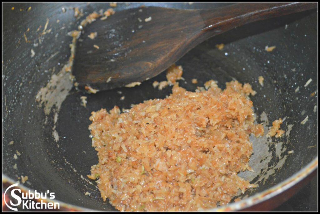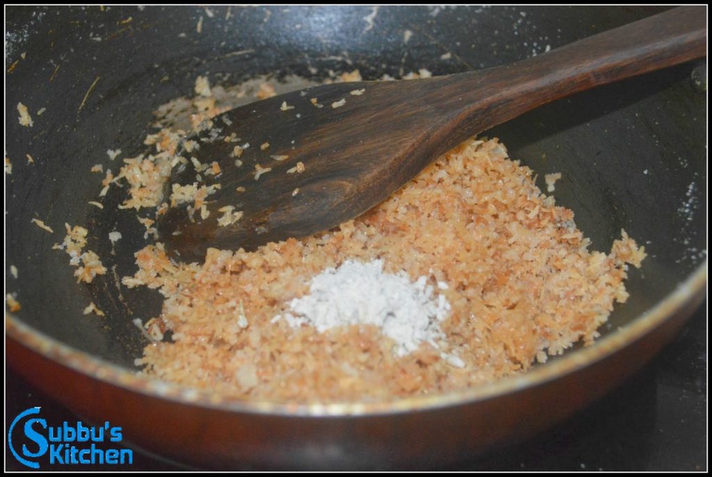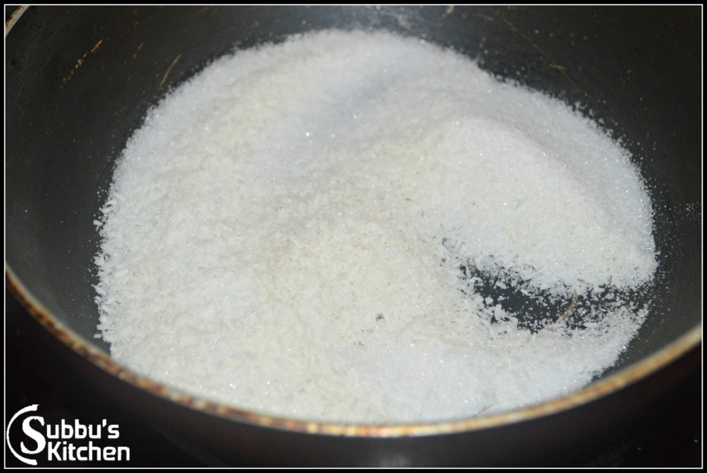 - Heat a pan and add sugar and grated coconut and start stirring till it rolls like a ball. Add Cardamom powder and mix well and add ghee and mix well