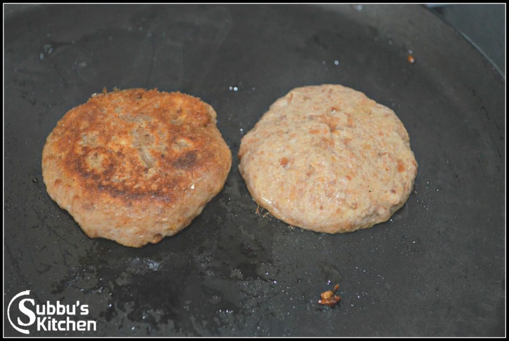 - Gently cover the cup, and pat it once to make it like a kachori so that filling nicely spreads in the kachori. Repeat this step for the remaining bread dough and filling. Heat a tawa and place 2-3 kachoris and pour oil around each kachori and keep the flame low and allow it to cook on one side. Then flip it off the other side and fry the kachoris and when both the sides turn golden brown color, remove them from flame and add the next batch.