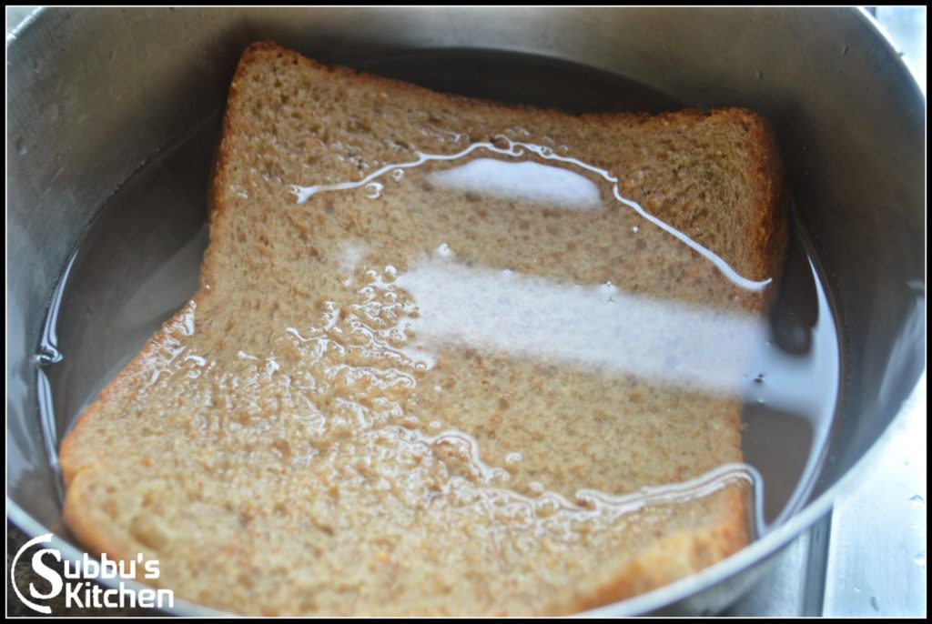 - Keep stirring the coconut-sugar filling and once it starts rolling, remove from flame. Allow it to cool off. Meanwhile, soak the bread slices in water and immediately remove from water
