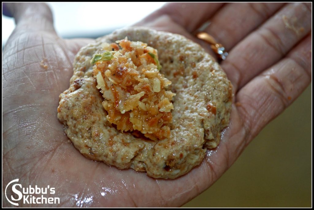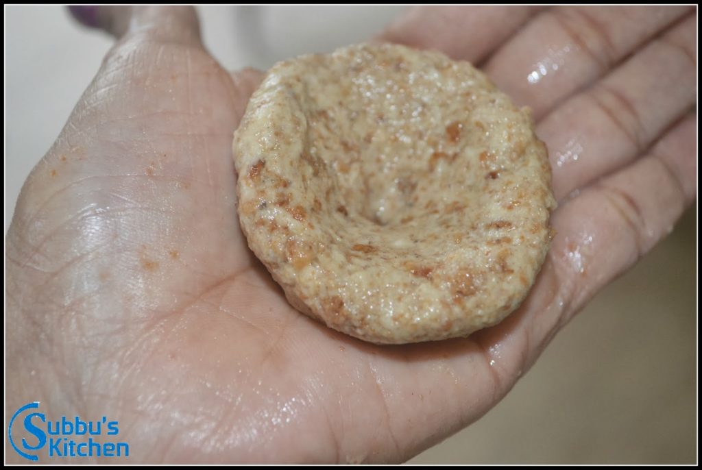 - Grease your palm with oil and take a lemon sized ball of dough and make like a cup as we do for kozhukattai outer cover and place a teaspoon of coconut filling in the middle of the cup