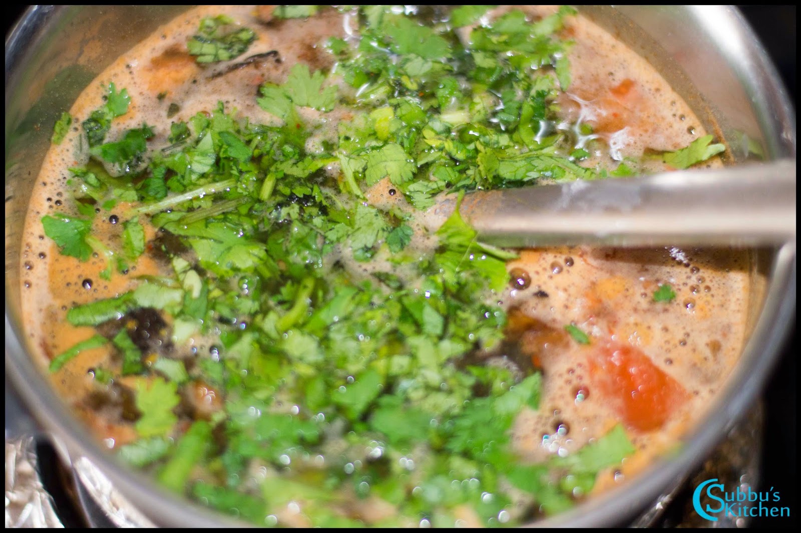 • Add mashed toor dhal and mix well. Also add the ground rasam powder into the mixture and allow the mixture to boil for about 2 minutes.