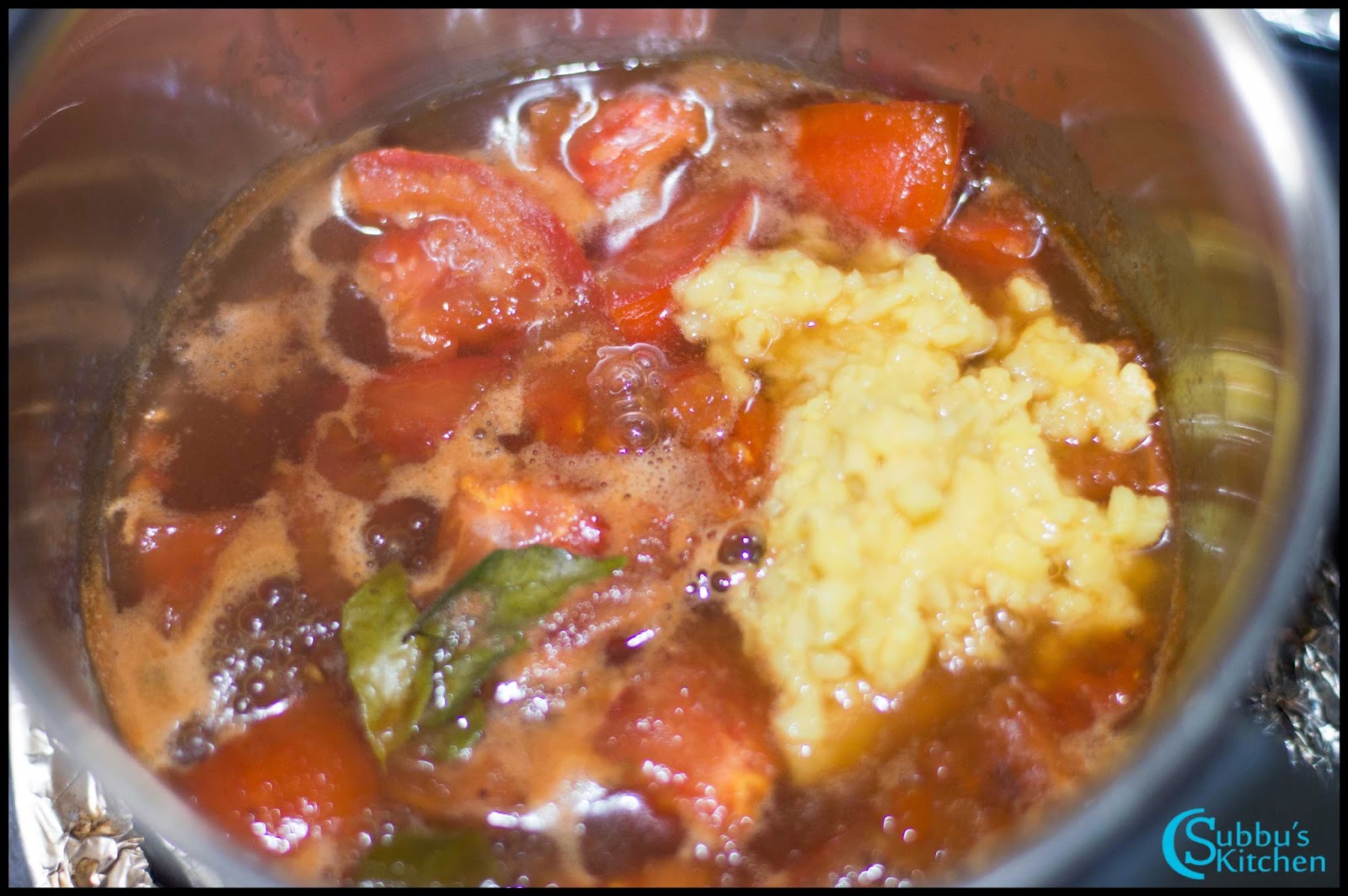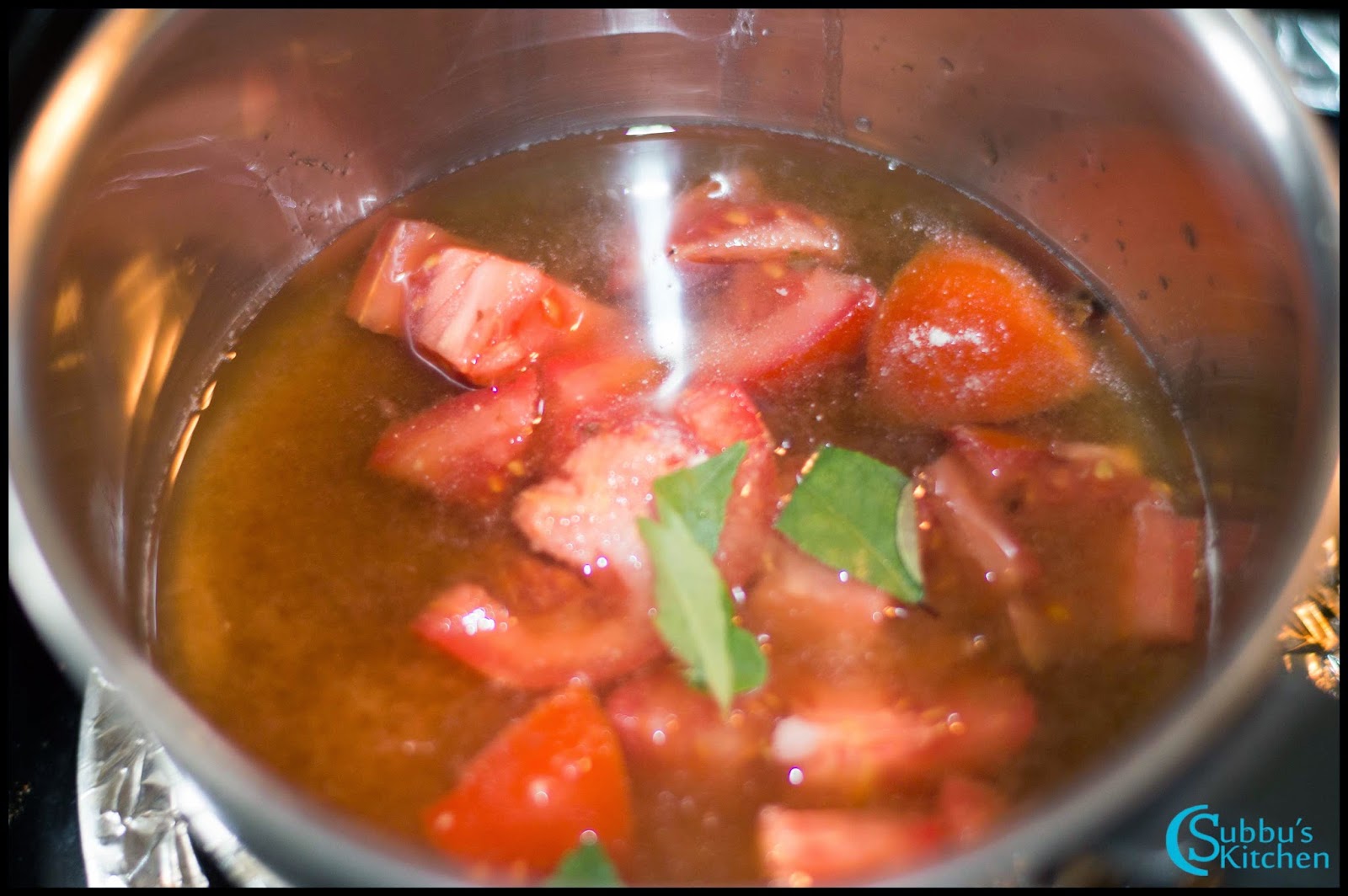 • Heat the pan and add the tamarind extract juice, chopped tomato, Salt, Hing, curry leaves and allow this mixture to boil till the raw smell of tamarind goes off.