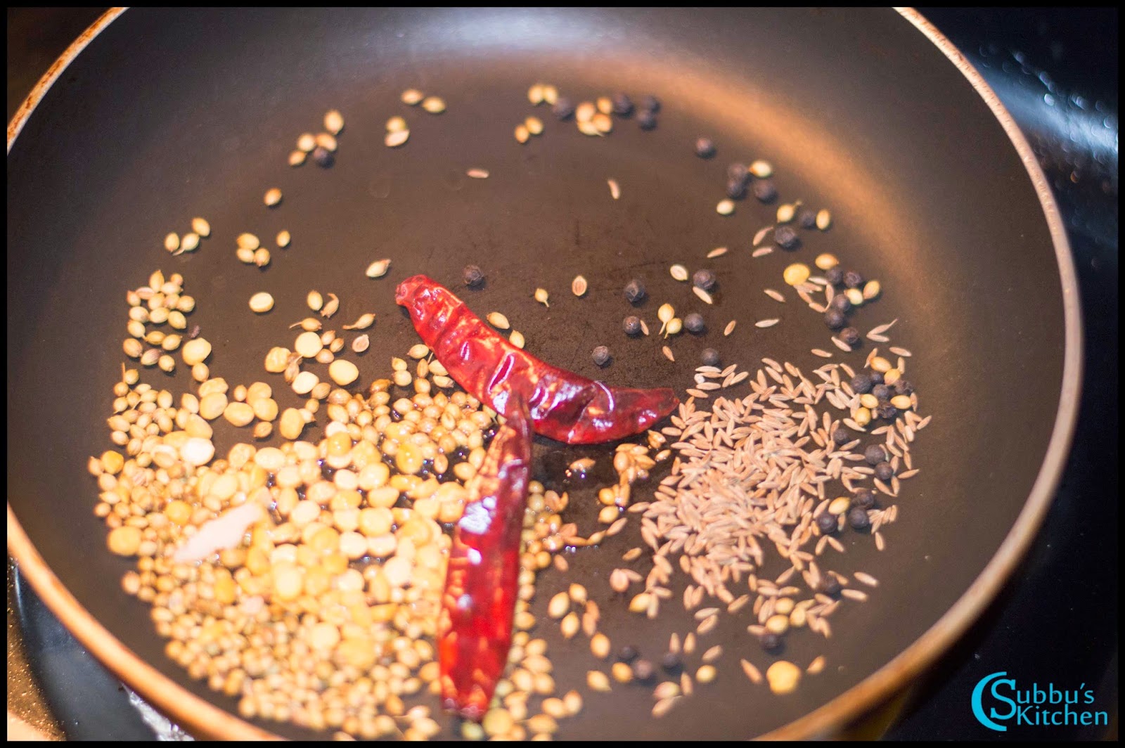 • Heat the pan and add 1 table spoon of oil. Once the oil gets heat, add the peppercorns, red chilli, coriander seeds and Toor dhal and fry them for a while (till the colour changes to light brown).