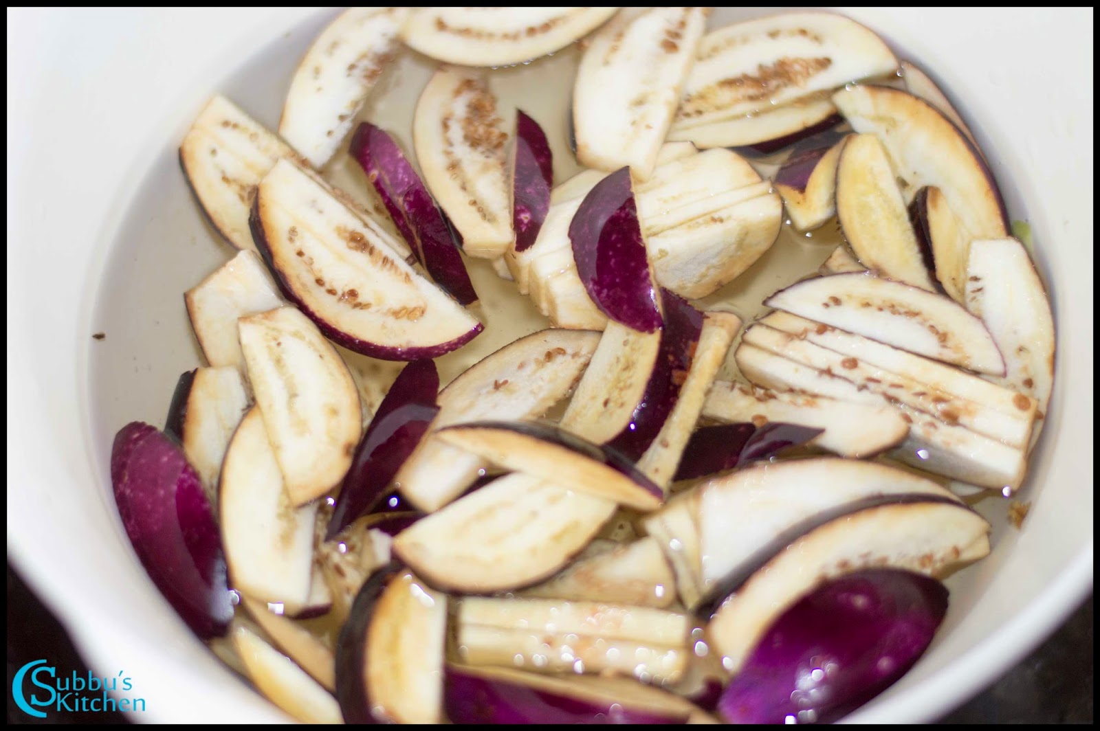 • Clean the brinjals and slit them vertically – cross cut from the base till the stalks and immerse them in the water to avoid discolouration.