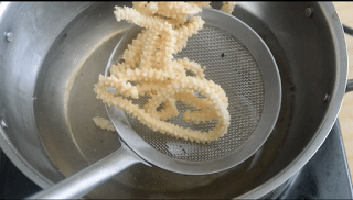 - Gently turn the murukku when one side if the murukku is fried and allow it to fry the other side. Remove the fried butter murukku and place it in tissue to drain the excess oil.