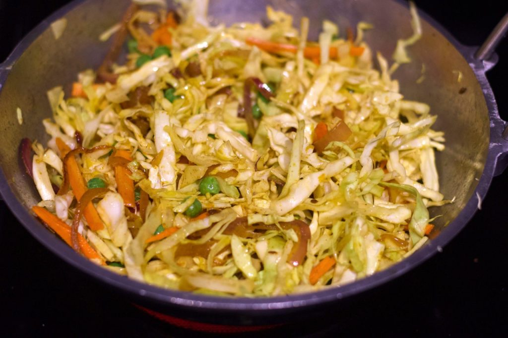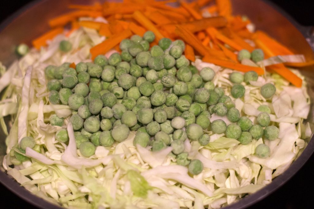 - When the onion is cooked add the vegetables - Cabbage, Carrot & Green Peas.