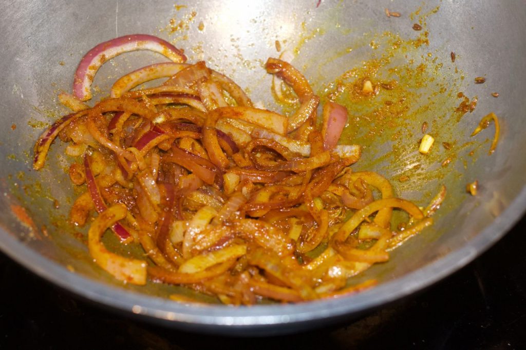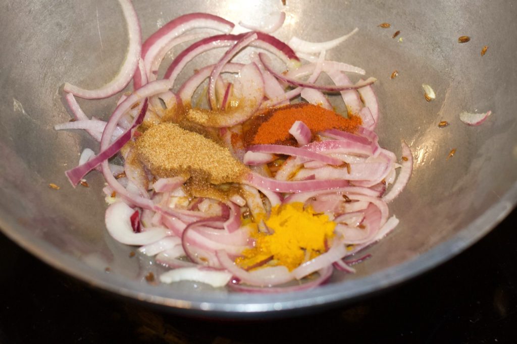 - When the cumin starts to crack, add the onions and mix nicely in the oil. Add pinch of salt which helps to cook the onion quickly.