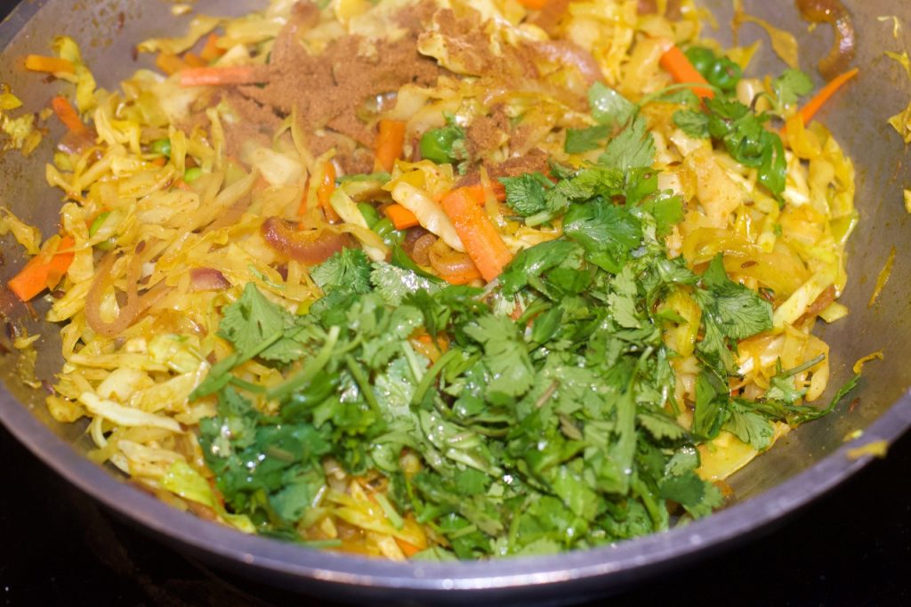 - When the onion is cooked add the vegetables - Cabbage, Carrot & Green Peas. Mix the vegetabels well with the onion and spices.