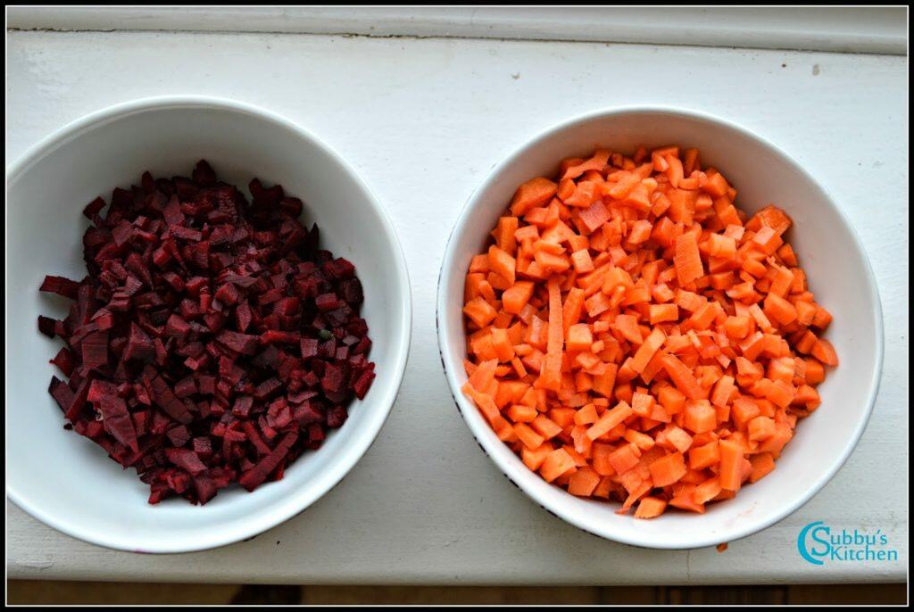 - Wash and peel the skin of carrot and beetroot and finely chop them into small pieces.
