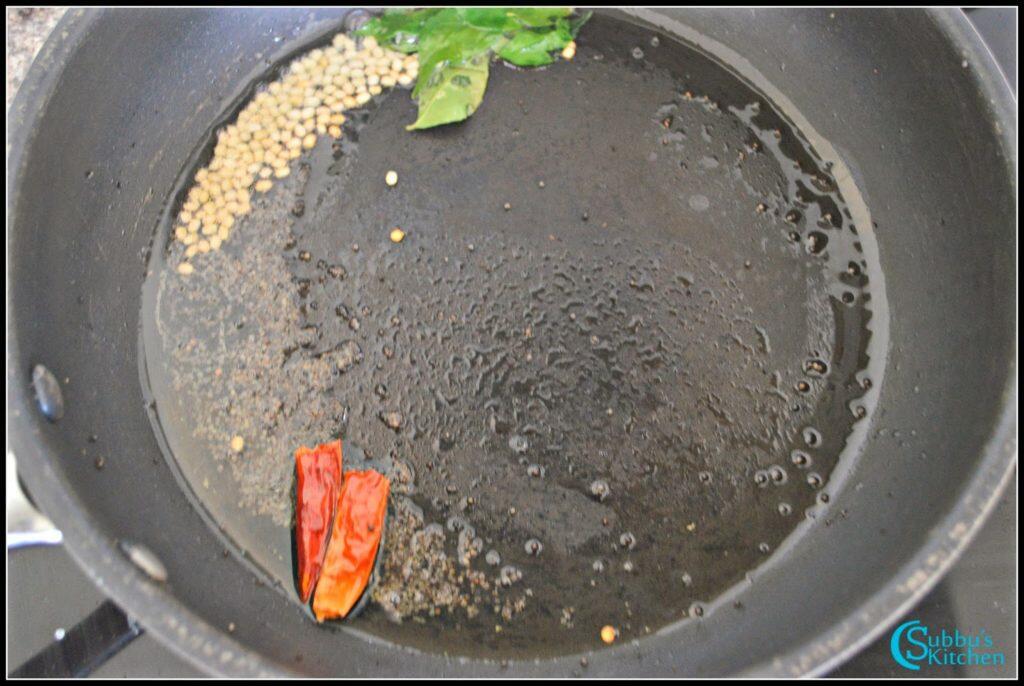 - Heat oil in a pan and when the oil is hot, add mustard seeds. When the mustard seeds starts to sputter, add split urad dal, broken red chili and fry them till the dal is golden brown color. Also add curry leaves and fry them for few seconds