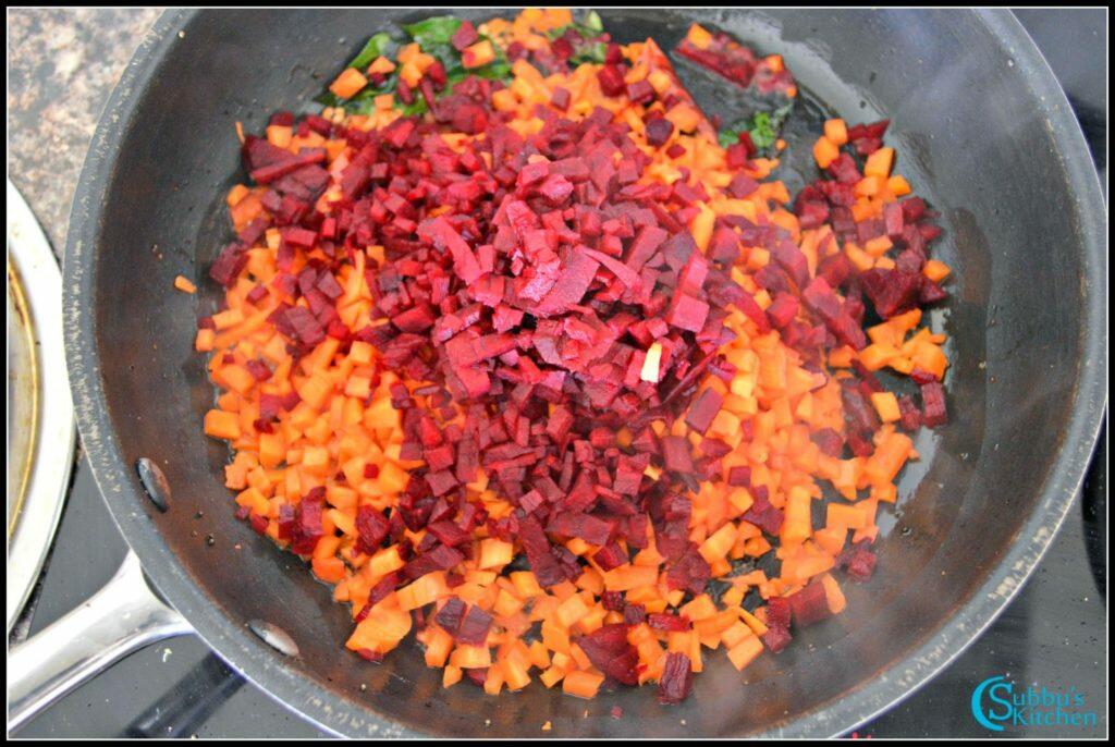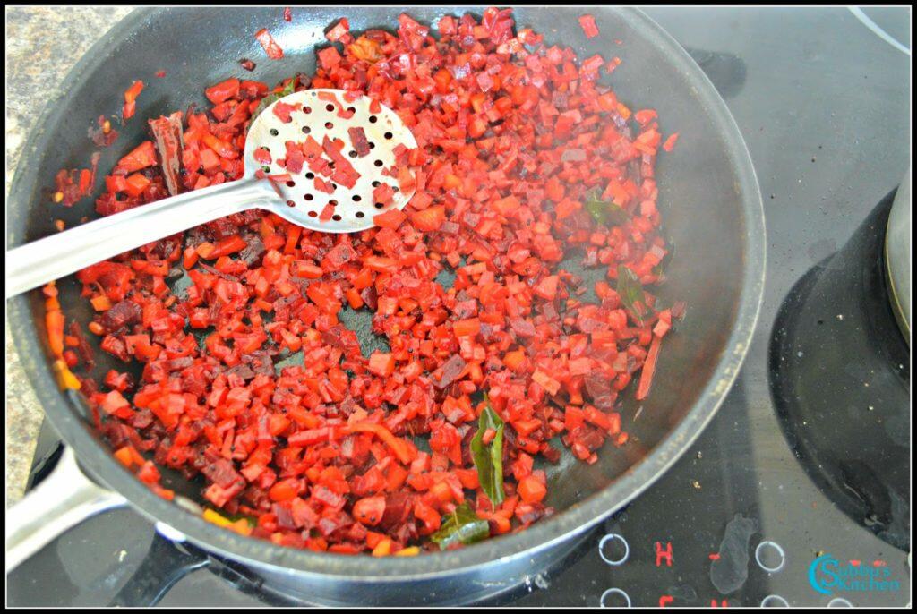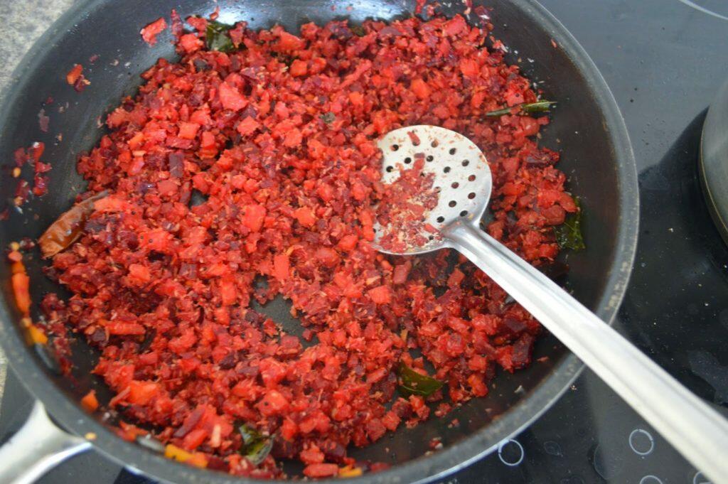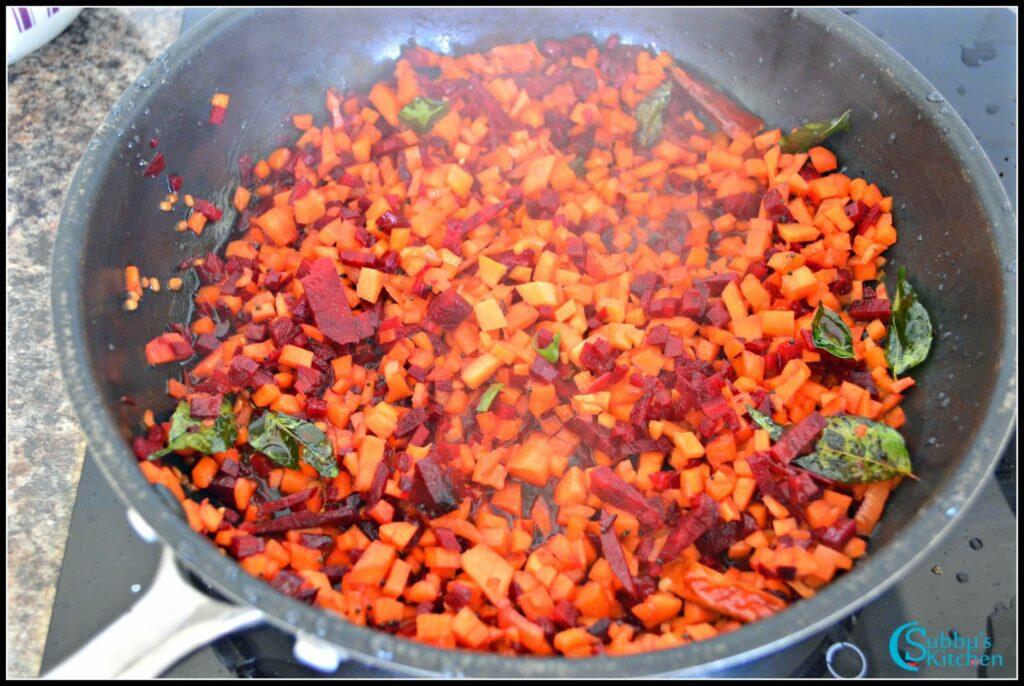 - Cooking of the vegetables : Carrot and Beetroot usually cook very fast, hence I prefer to cook this on a skillet. You can also cook it in the pressure cooker to save the time; however, it could get mushy.