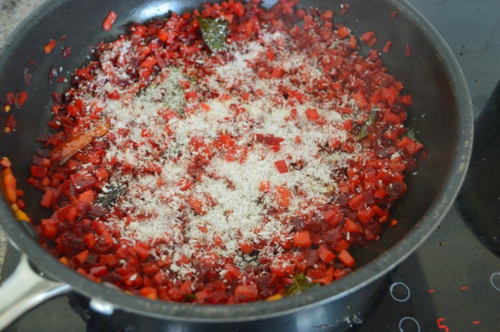 - When the carrot and beetroot are fully cooked, add grated coconut and mix well. Keep the poriyal in flame for another couple of minutes and then remove from flame