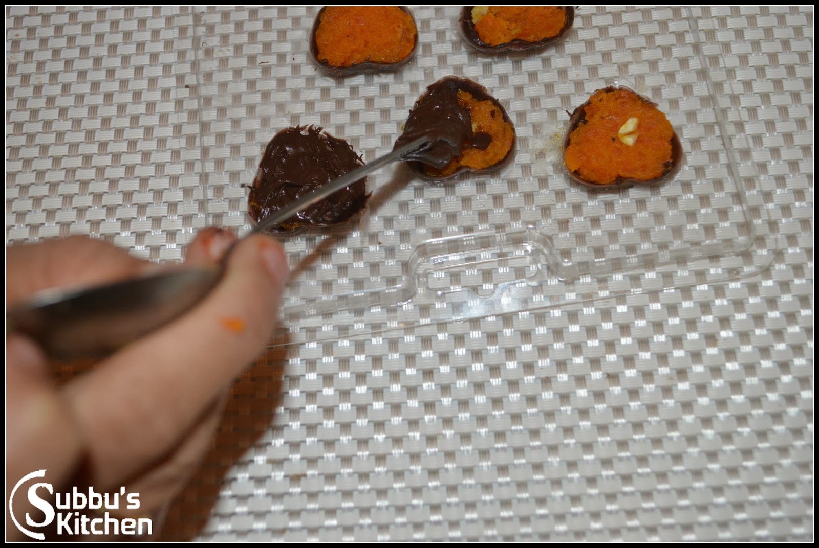 - Take the mould and usinga spoon or pastry brush coat the mould with the melted candy. Refrigerate the mould for 5 minutes. After 5 minutes take out the mould from refrigerator and you can see the cating would have been hardened. Fill the mould with the carrot halwa till the brim of the mould and press it nicely leaving some space for the candy melt. Put the mould again in the fridge for 5 minutes. The carrot halwa filling need to be firm before we coat the opening with candy melt again
