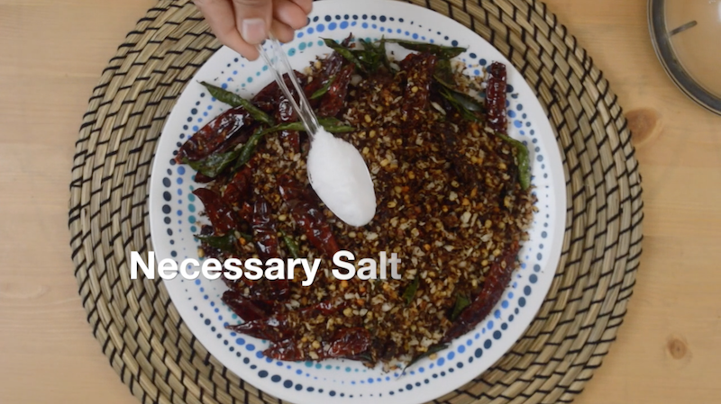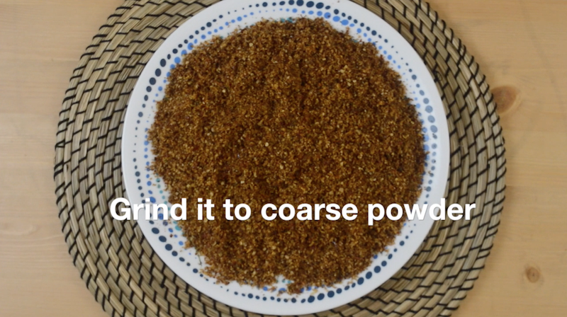 - Allow these roasted ingredients to cool off completely. Add salt and grind everything to a coarse powder. Store the chammanthi podi in an air-tight container