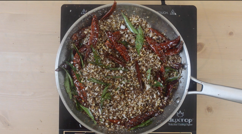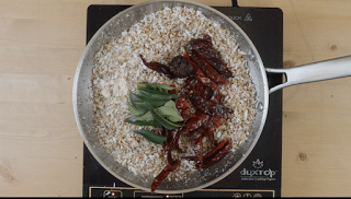 - Then, add red chili, tamarind, asafetida, curry leaves and dry roast everything till coconut turns deep brown color